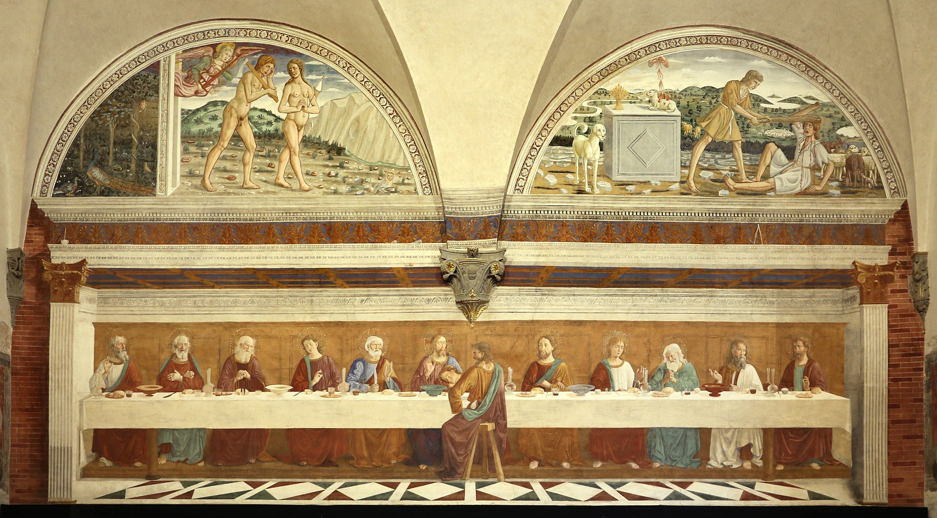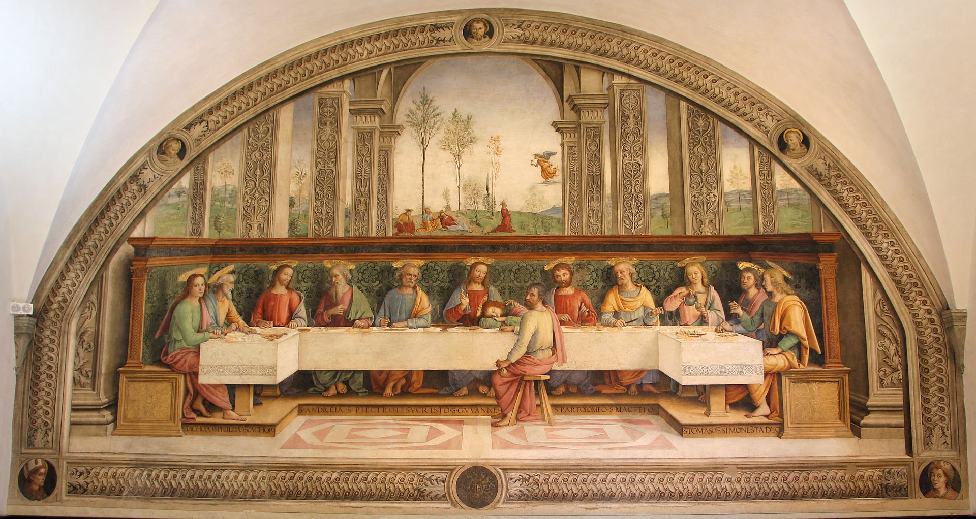¿Pueden adivinar a qué se refiere? ¡Claro! Al detalle más evidente de la pintura: Los 12 discípulos de Jesús, y el mismo Jesús, están sentados de frente, en un mismo lado de la mesa. Esta disposición iconológica, que responde a la visión del espectador y no a la “realidad” de una cena, se convierte en canónica y así se representa la última cena en los cenáculos (reuniones de pocas personas con intereses en común) de Florencia.